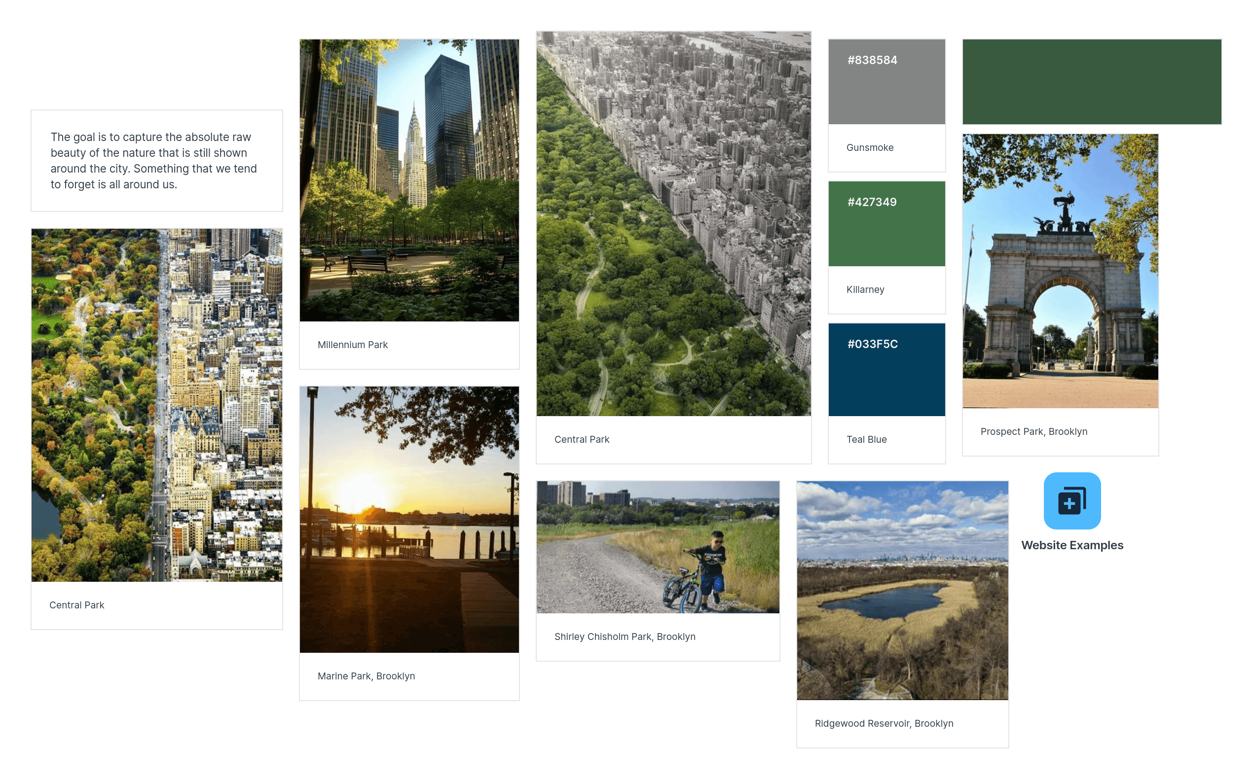 Mood board for the website to identify the mood for the photography and colors.