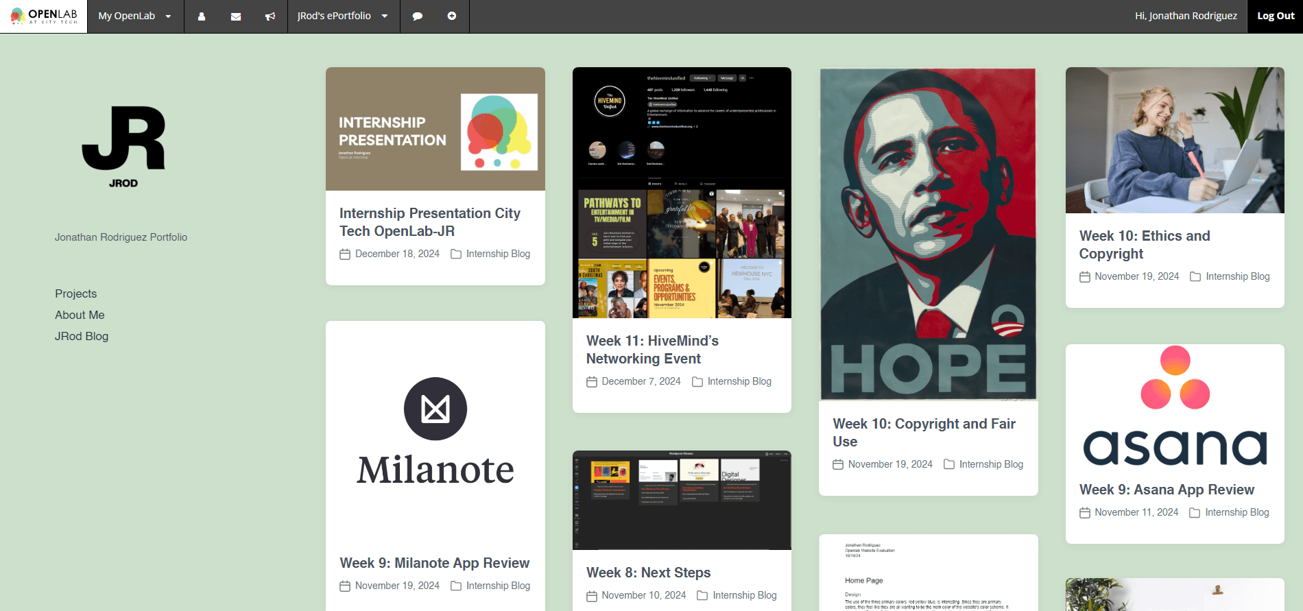 For our first project, we worked on improving and updating our own OpenLab ePortfolios. The goal here was to set an example for both COMD students and non-COMD students to show what’s possible when you fully utilize OpenLab’s tools and themes.